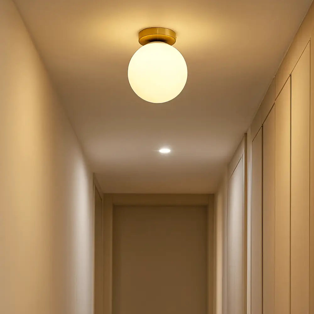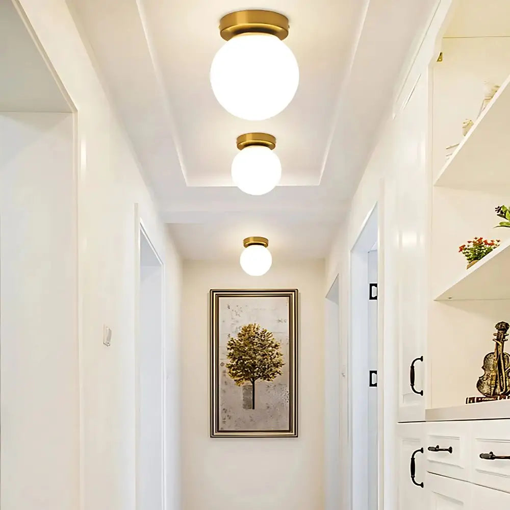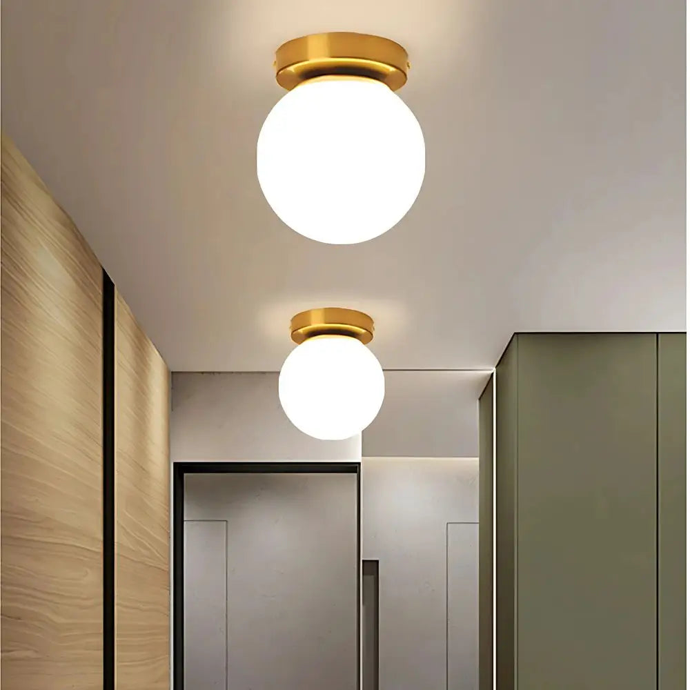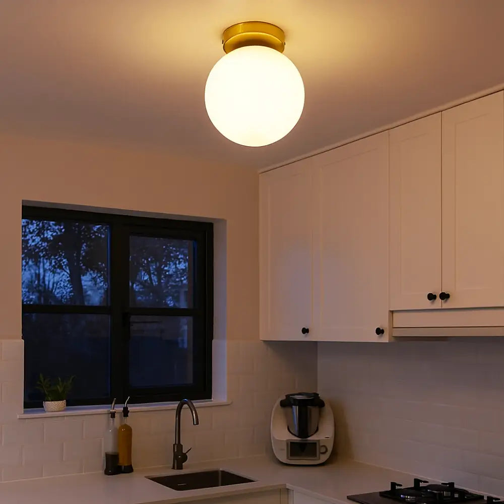 Le Plafonnier Boule en Verre Doré marie une esthétique classique et contemporaine à travers un globe en verre opale dépoli et une base en laiton doré brossé. Sa forme ronde et son éclat discret créent un rendu élégant qui s’adapte aussi bien à un intérieur moderne qu’à un espace au charme plus rétro. Parfait pour les petites pièces comme les couloirs, les toilettes ou les salles de bain, il apporte une note raffinée sans surcharge visuelle.